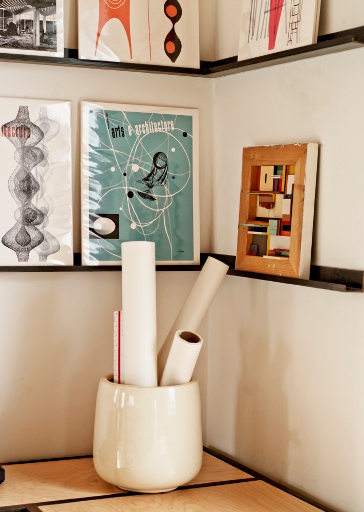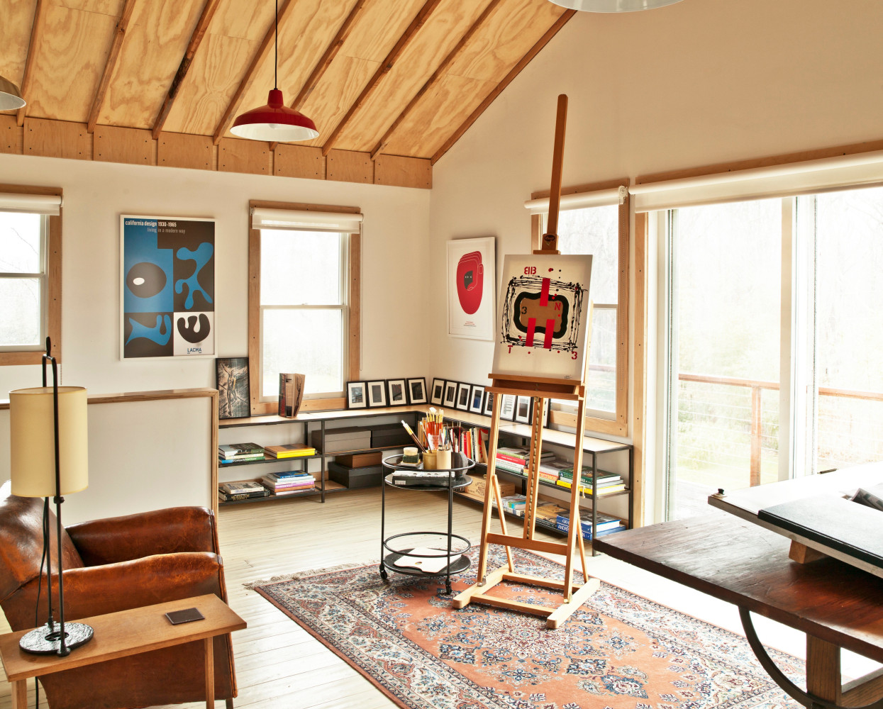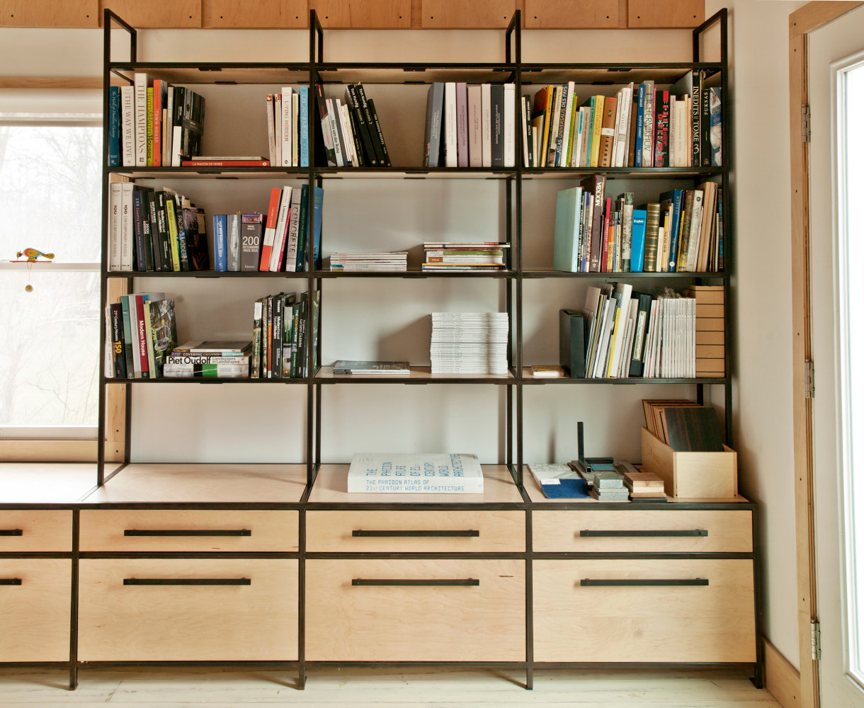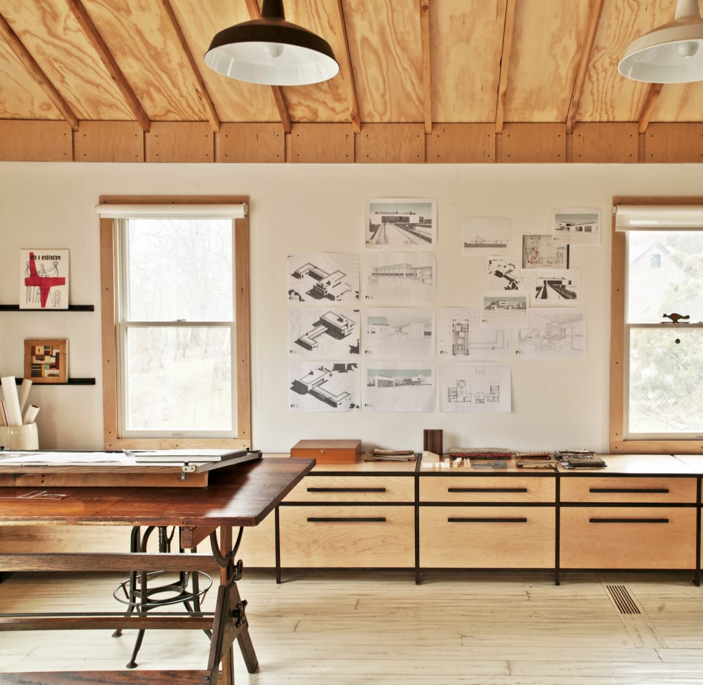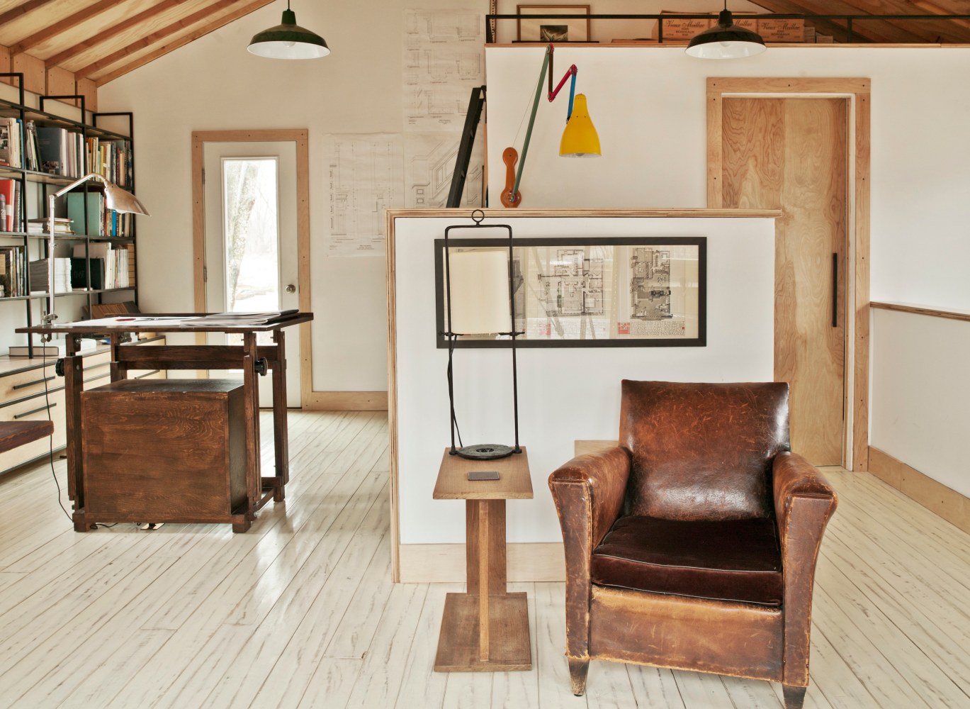 The atelier called for a bright, open, serene and simple space that could inspire but also satisfy the practical needs of the owner. RND took an honest approach to both substance and space, using materials such as raw plywood for the trim, windowsills and even as an eco-friendly insulation, to custom cabinets and bookshelves made from blackened steel. Opening out the ceiling provided a new take on the space's natural light, while hand-carved, hand-painted reclaimed white oak floors add a calming brightness. The custom designed drafting and side tables, industrial colored light fixtures, and an additional 1940s American drafting table and matching stool offer a complete aesthetic to the practical side of the furniture, while the 1930s French leather club chair provides an anchor of contemplative comfort.