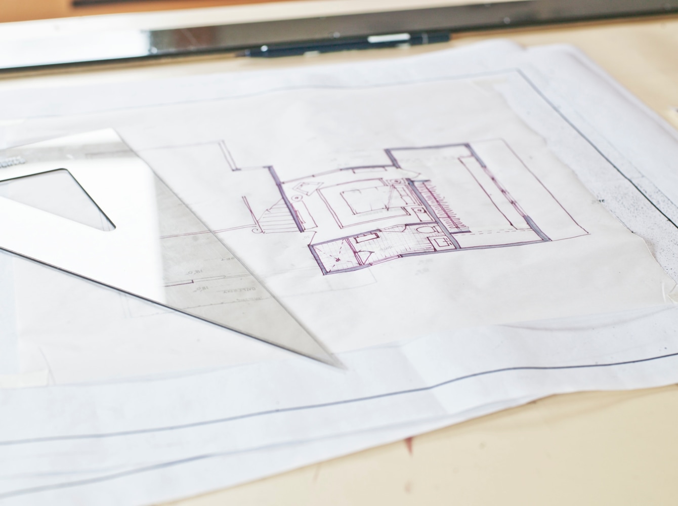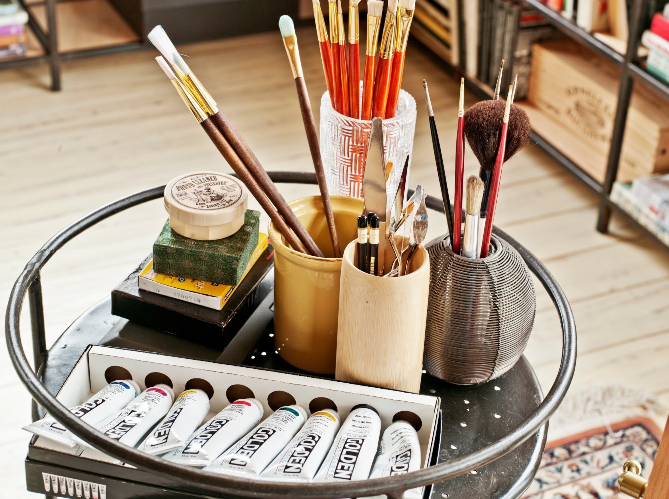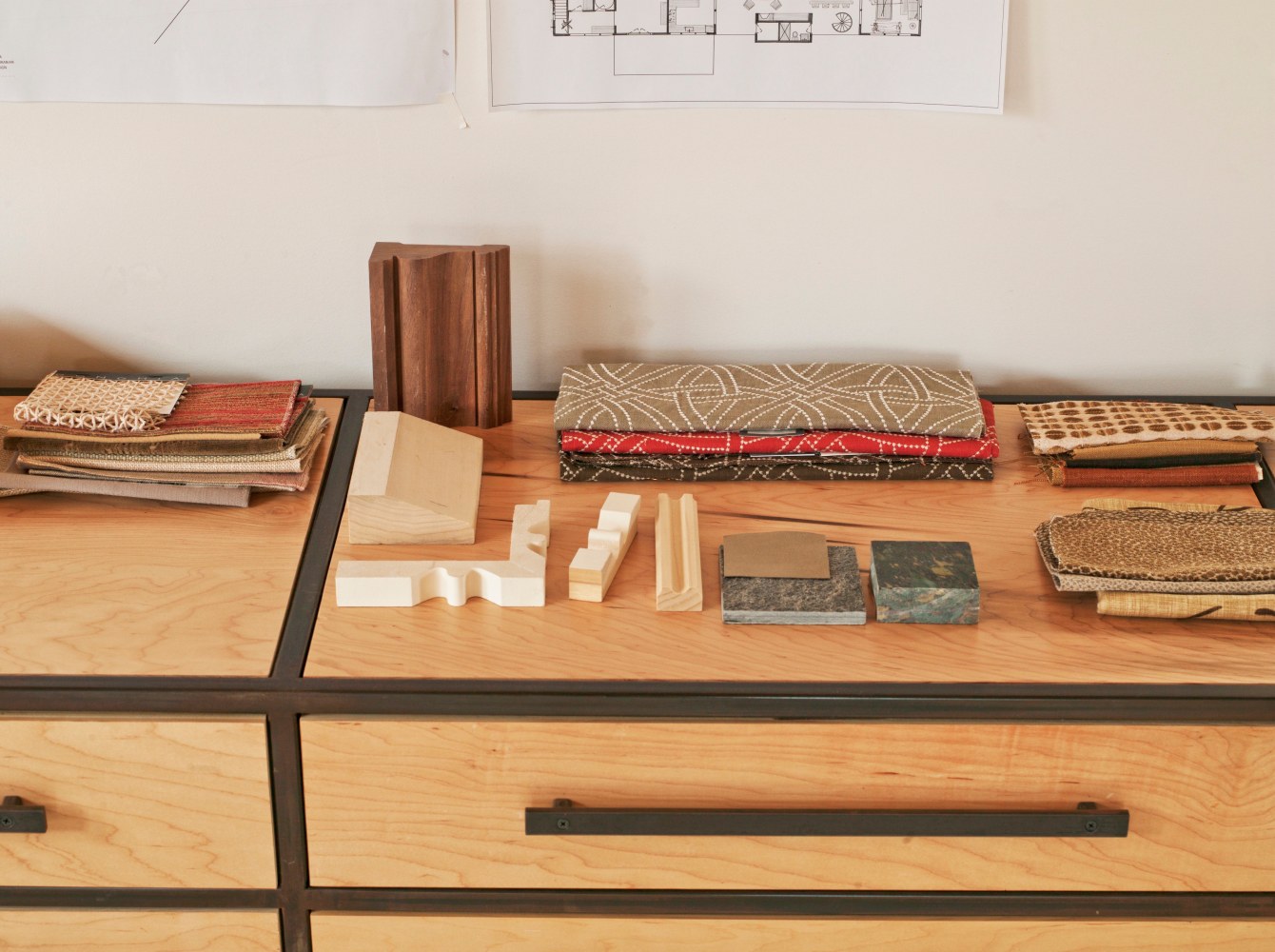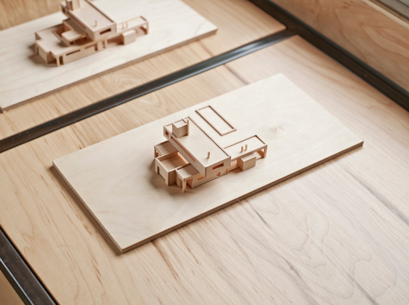 The atelier called for a bright, open, serene and simple space that could inspire but also satisfy the practical needs of the owner. RND took an honest approach to both substance and space, using materials such as raw plywood for the trim, windowsills and even as an eco-friendly insulation, to custom cabinets and bookshelves made from blackened steel. Opening out the ceiling provided a new take on the space's natural light, while hand-carved, hand-painted reclaimed white oak floors add a calming brightness. The custom designed drafting and side tables, industrial colored light fixtures, and an additional 1940s American drafting table and matching stool offer a complete aesthetic to the practical side of the furniture, while the 1930s French leather club chair provides an anchor of contemplative comfort.