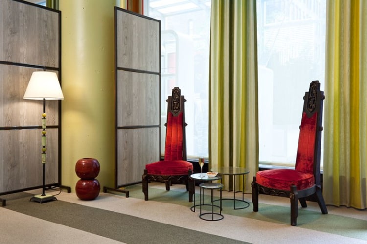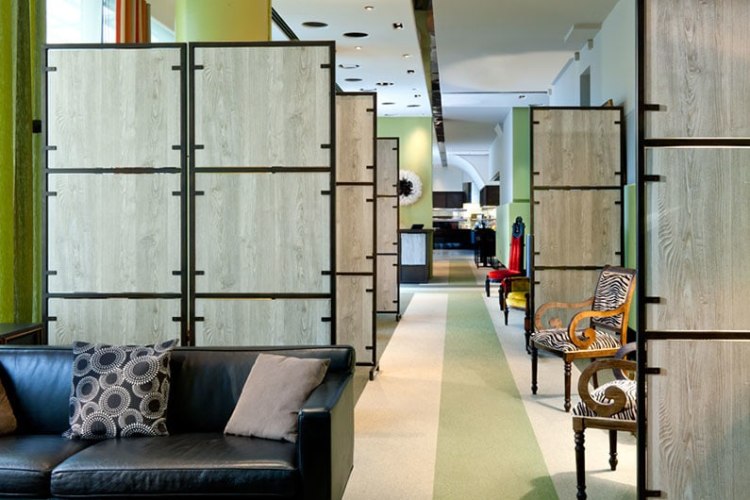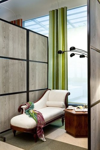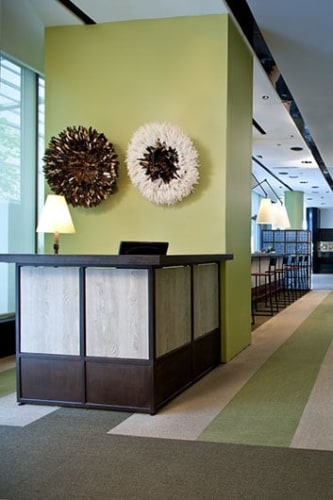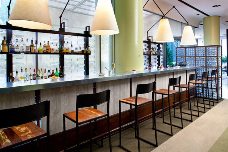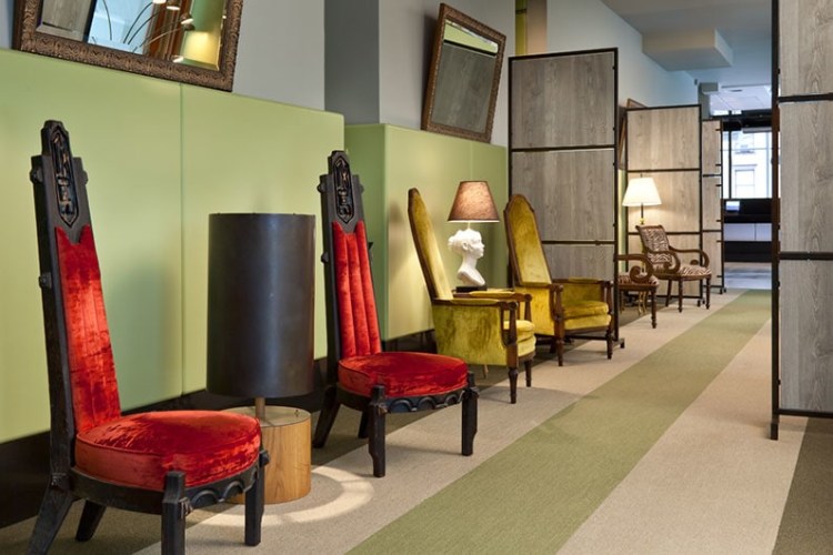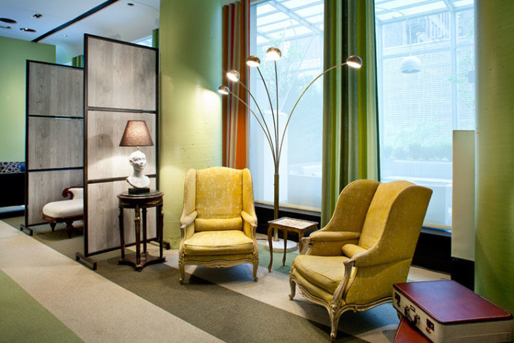 Light and elegant, stately yet urban, RND's reimagining of the lounge of Hotel Eventi, a Kimpton branded Hotel in New York's Fashion District, used a natural green palette to open the interior to the leafy tones of the adjoining covered patio. The flow of linen curtains from Parisian fine fabric maison, Nobilis, accent the space with an airy feel while the striped directional carpeting offers guests a sense of calm orderliness. In the bar, the matching sheen of metal and wood refers to the lounge's complementing pieces of vintage and modern furniture, each quietly offset by a series of custom designed partitions that allow the space a modular flexibility to alternately meet the needs of events and functions and everyday relaxation.