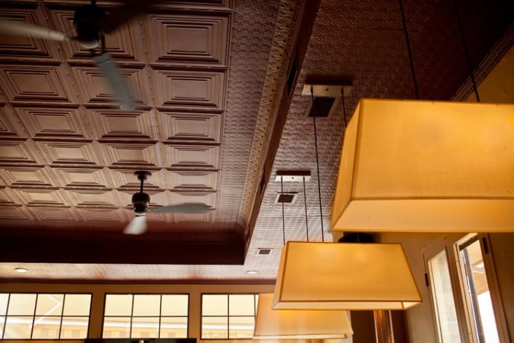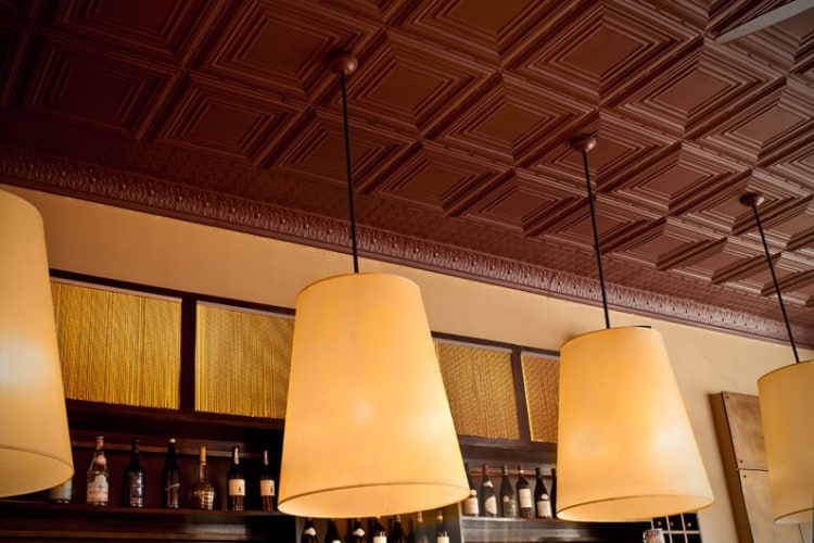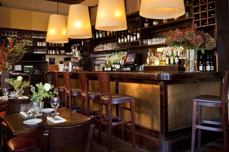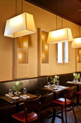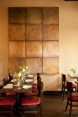 The Park Slope bistro called for the creation of a comfortably elegant ambiance that could evoke the gourmet quitodien of a Parisian bistro, but set in a classic New York environment. Preserving original architectural features like the patterned tin ceilings, RND re-imagined the space with oversized pendant lighting and a subtle fusion of wood and bronze. A palette of reds, including the burgundy colored ceilings and bistro-red chair seats, gave the space a dash of playfulness, while the bronze tile wall sculpture adds a focus of sophisticated beauty.