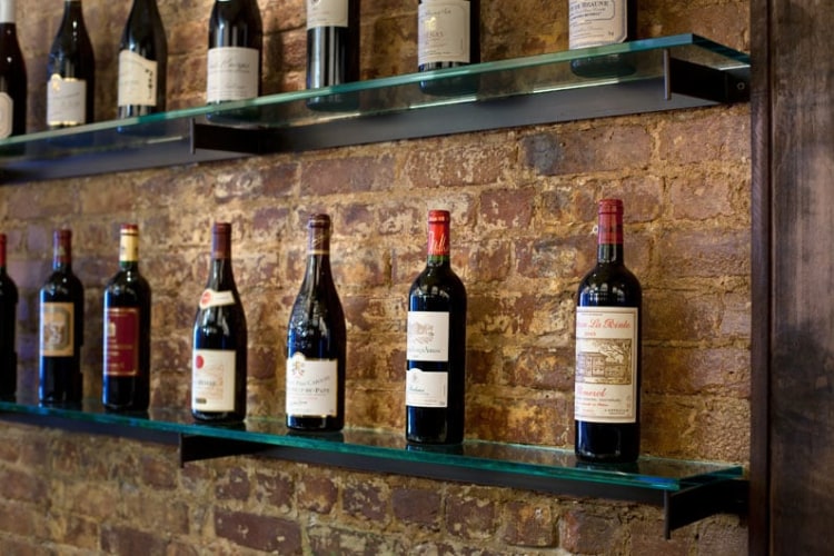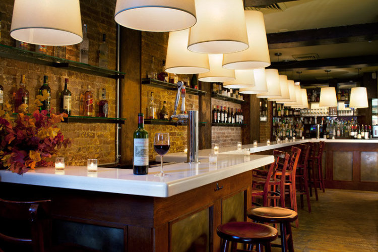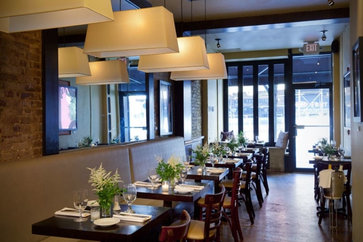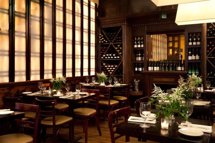 Designing for the same chef-owner of the bistro in Park Slope, RND set out to create a space for the Upper East Side bistro in keeping with the restaurant group's identity, but that would also present an aesthetic of its own. Working with the original brick walls, steal beams, and a central fireplace, RND created a design that could highlight the modern elements of these original structures and refer to the aesthetic history of New York dining. An abundance of oversize pendant lighting balanced the deep tones of dark wood, while light custom glass shelving offsets the heavier lines of the wood.