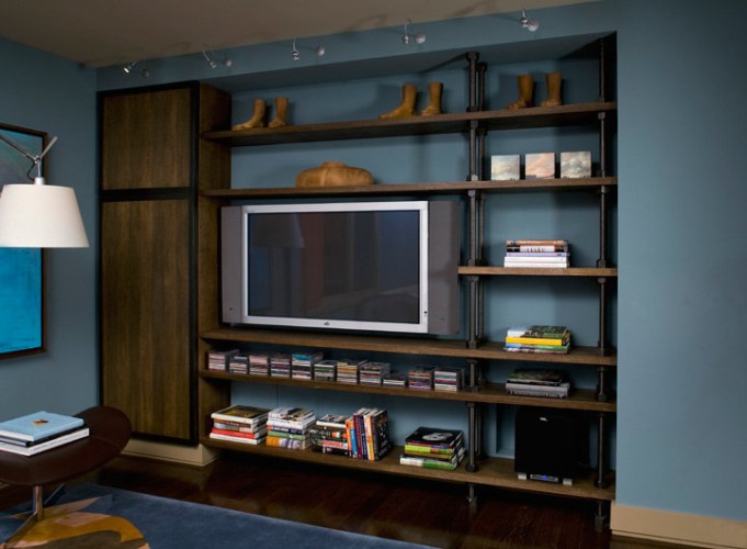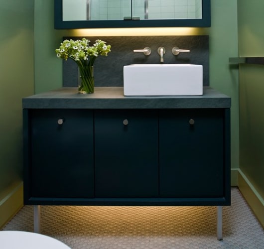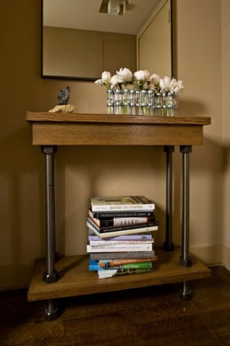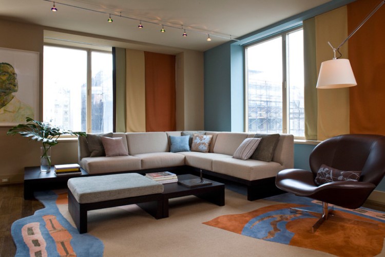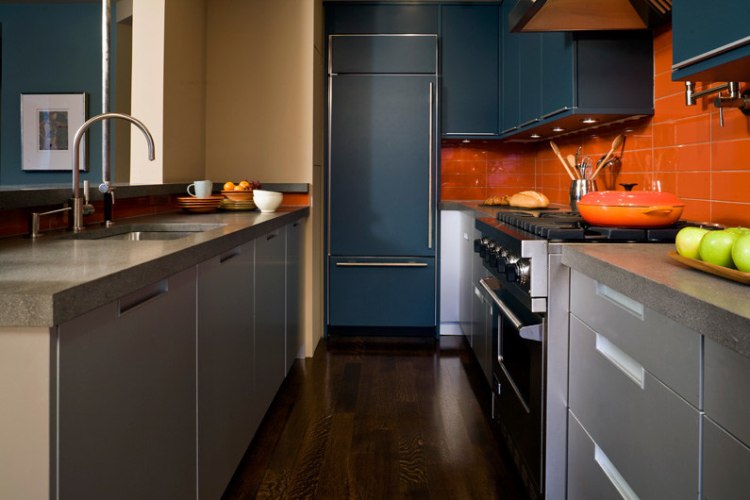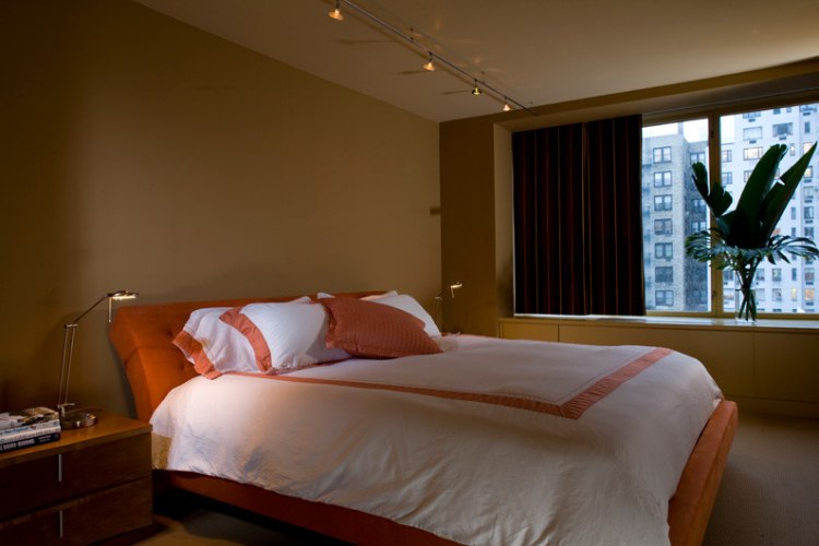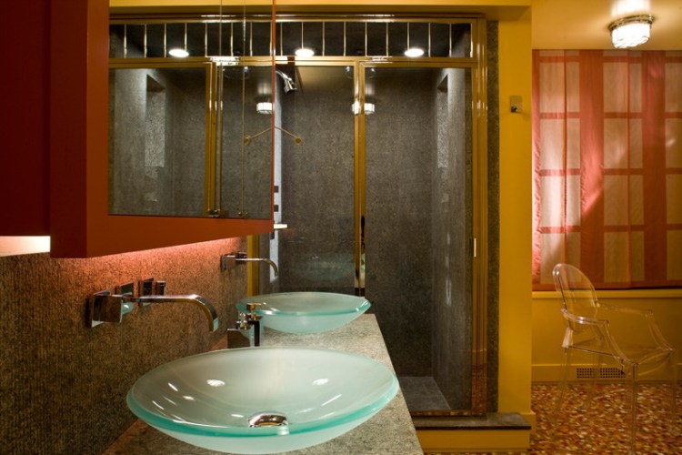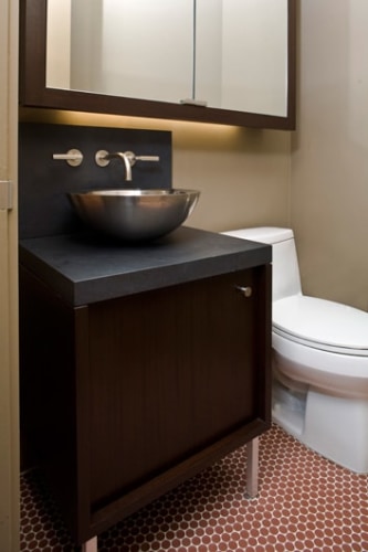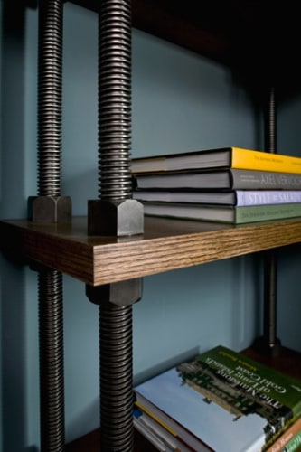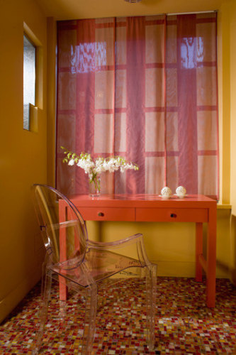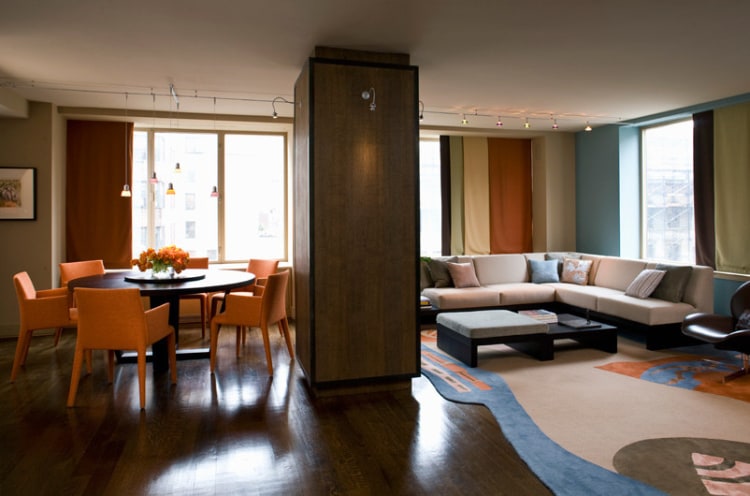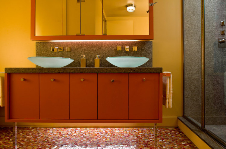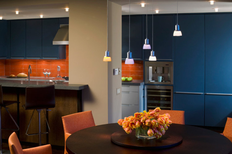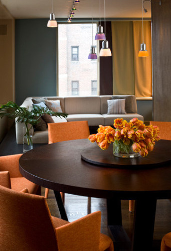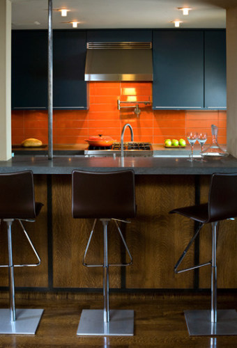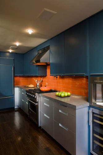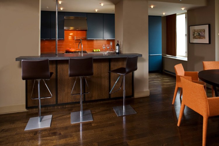 RND undertook a complete reimagining of the Upper East Side pied-à-terre, reorienting the kitchen to open onto the living space, renovating the bathrooms, and implementing a custom color palette throughout. The design evokes playful elegance, with modern furniture blending with elements of industrial design, like oversized nut-and-bolt shelving, and bathrooms splashed with glass tile mosaics and custom vanities. The polished wood and speckled granite surfaces work with the cobalt blue and cadmium orange tones of the color palette to create a naturally warm ambient light.