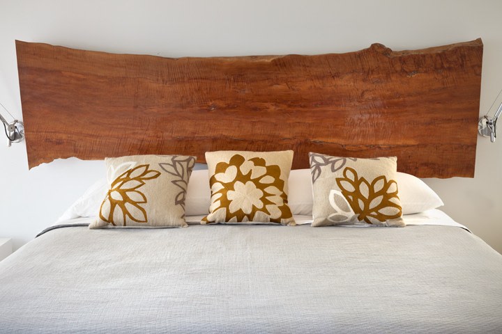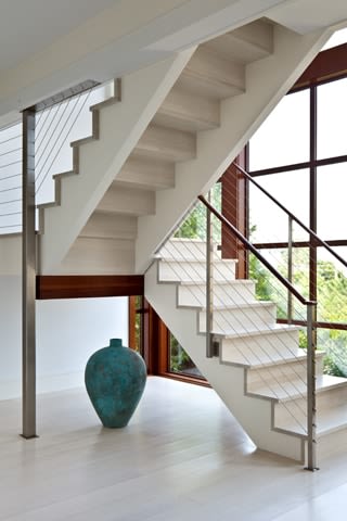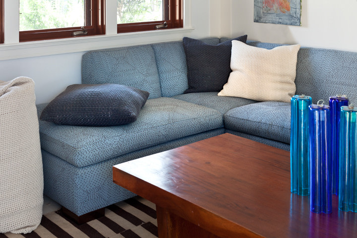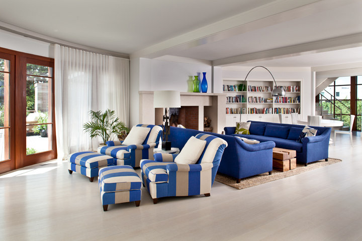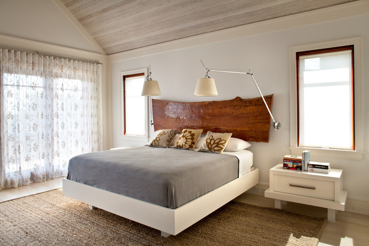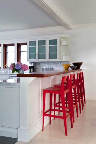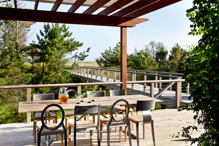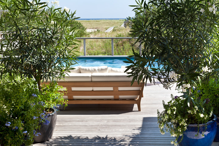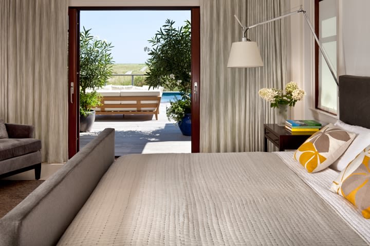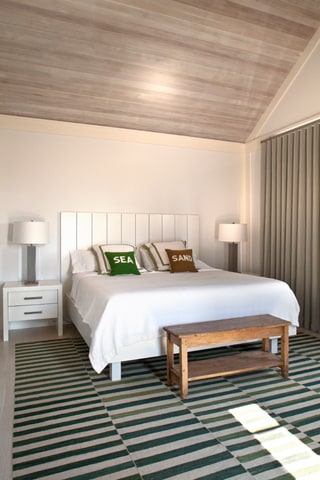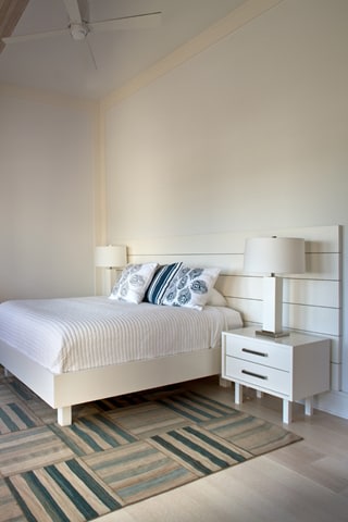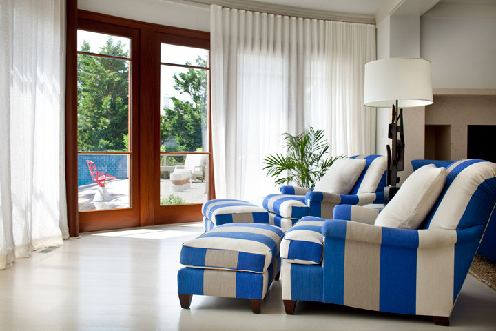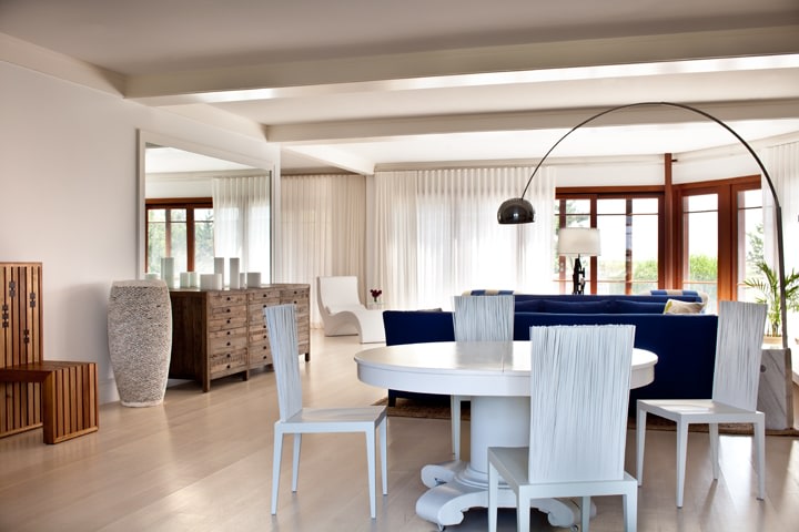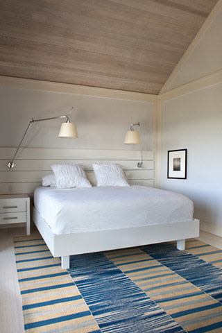 The owners of the Westhamtpon Beach house sought an interior treatment that could elegantly accommodate the energy and activity of their college-aged children and their twenty-something friends. Taking inspiration from the sea, sky and clouds, RND laid down a base of "whites and woods," with custom-designed oversized sofas and armchairs covered by the bold blue tones of fabrics from a famed Parisian maison, custom made beds and bedside tables in all of the house's bedrooms, and a full-slab, polished-wood headboard à la George Nakashima adorning the master bedroom. Area rugs of either natural woven material or kilims made in the Caspian Sea region of Iran bear simple geometric designs that call to mind classic patterns of seaside life, while the white-stained, wide-plank oak floors preserve a clean, light-filled naturalism throughout.